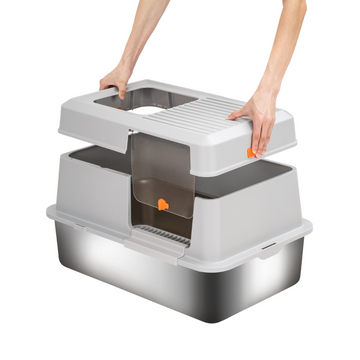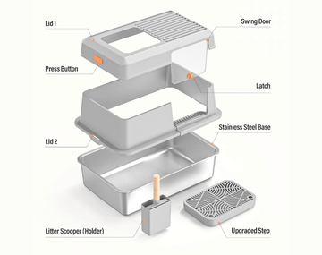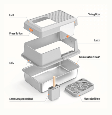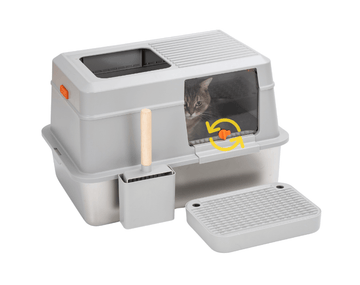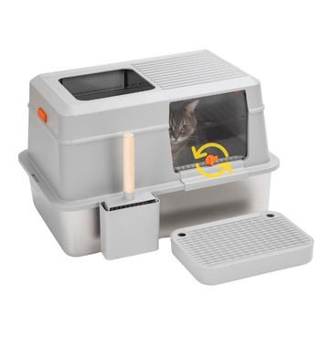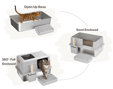 Experience the ultimate in convenience with our convertible stainless steel cat litter box. Designed for both enclosed and open use, it features dual entries, triple litter recycling systems, and an adjustable flap door with three access modes. Ideal for larger breeds and multi-cat households, this litter box minimizes scatter, simplifies cleaning, and provides unmatched versatility.