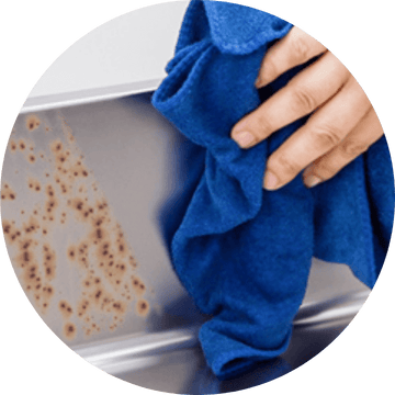 Empty the cat litter from the base first. Then simply wipe the base down with mild soap and water for a quick and thorough clean. Please make sure the metal base is dry before pouring the clean litter in.